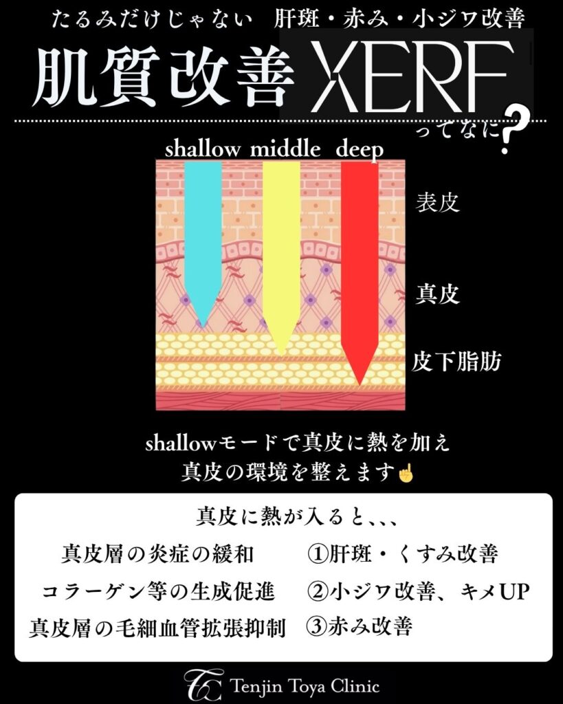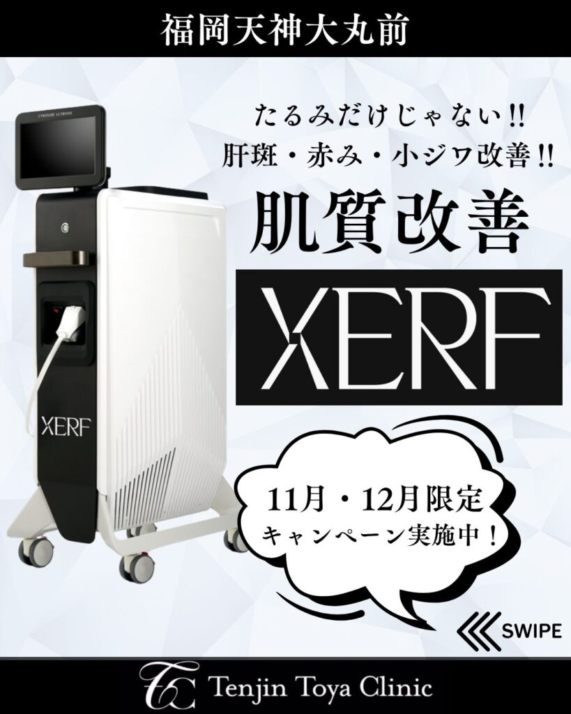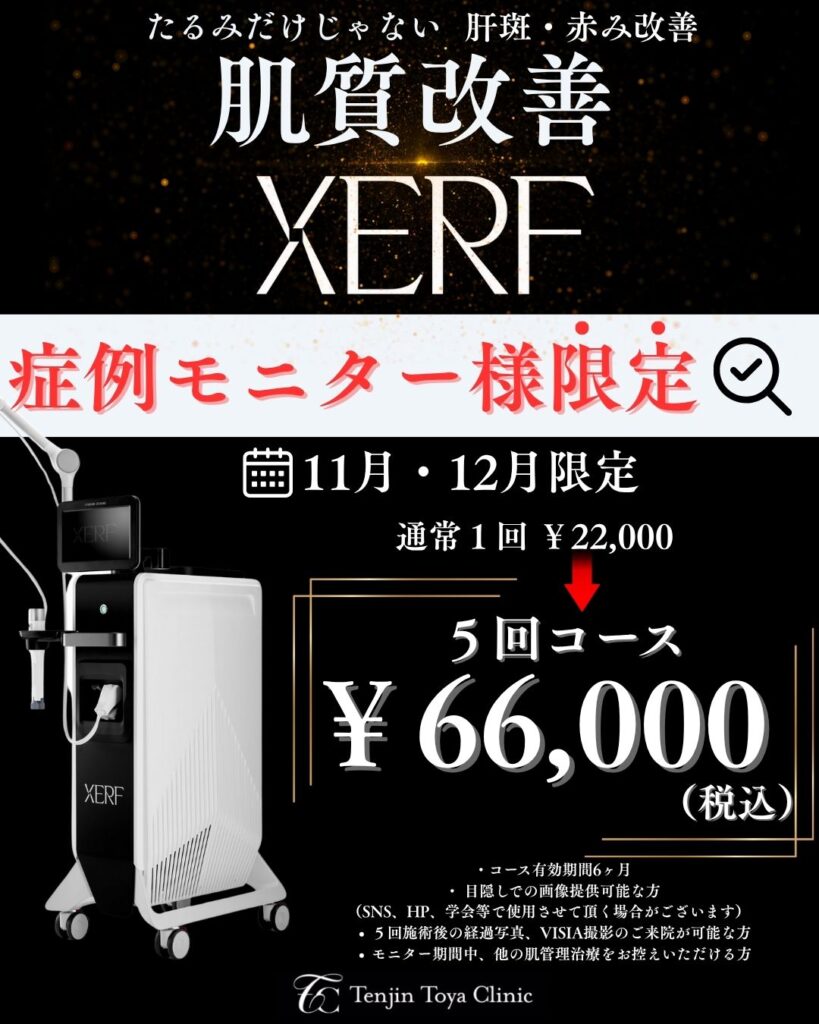 福岡天神大丸前、Tenjin Toya Clinicです🏥 最近ぐっと寒くなってきましたね❄️ 体調を崩しやすい時期ですが、いかがお過ごしですか? 🍁11月・12月限定【肌質改善】キャンペーン🍁 たるみ治療として大人気のザーフ❤️ 実は、たるみだけでなく、肝斑や赤ら顔、小ジワにも効果があるんです☝️ 肌質改善に特化したモードで真皮に熱を与えます! 肝斑『レーザーや光治療できない』と言われた方にぜひオススメです✨ ✅肌質改善ザーフの症例モニター様募集中です 肌質改善XERF 通常1回¥22,000→5回コース¥66,000✨ ✅肝斑&くすみにWアプローチ🌟 肌質改善XERF+メソナj美白 通常¥44,000→¥29,800✨ ーーーーーーーー また11月月末まで【秋のXERFまつり】も引き続き、開催しております! ✅ 【Ns施術】ザーフ200ショット 通常¥66,000→¥52,800✨(20%OFF) ✅【Ns施術】ザーフ300ショット 通常¥88,000→¥70,400✨ (20%0FF) ✅【Ns施術】ザーフ60oショット 通常¥121,000→¥96,800✨(20%OFF) ~プレミアム特典~ ザーフ600ショット施術を受けられた方のみ、"細胞からのアンチエイジング"ヒーライトⅡ照射3回(¥13,200相当)プレゼント!!! 皆様のご来院をお待ちしております☺️ 【Tenjin Toya Clinic】 福岡市中央区渡辺通5-24-32 FPGlinksTENJIN MINAMI5F 「アイムドーナツ」さん🍩と「マーラータン」さん🍜この行列に挟まれた、1階にセブンイレブンさんがある黒いビルの5階です。 🕰️診療時間 月火水金9:30-17:30 (昼休みなし)最終受付17:00 ・土日祝の診療日はInstagram、ホームページをご参照ください❤️ ・木曜日は皮膚科・美容皮膚科休診日ですが、点滴、ヒーライト2、newronn、物販購入の方のご案内は可能です❤️ ・ご予約は、電話予約、LINE予約、Web予約で承っております。 💚LINE予約、Web予約 24時間受付中です。